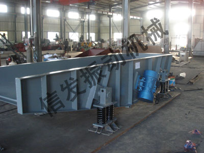 機(jī)器由箱體、振動(dòng)電機(jī)、柵條排和彈簧減振裝置等四部分組成。箱體為一剛性結(jié)構(gòu),內(nèi)測(cè) 與物料接為雙臺(tái)階式,間隙呈楔形以利徘料,柵條材質(zhì)為耐磨高錳鋼。減振裝置采用優(yōu)質(zhì)螺旋 彈簧。